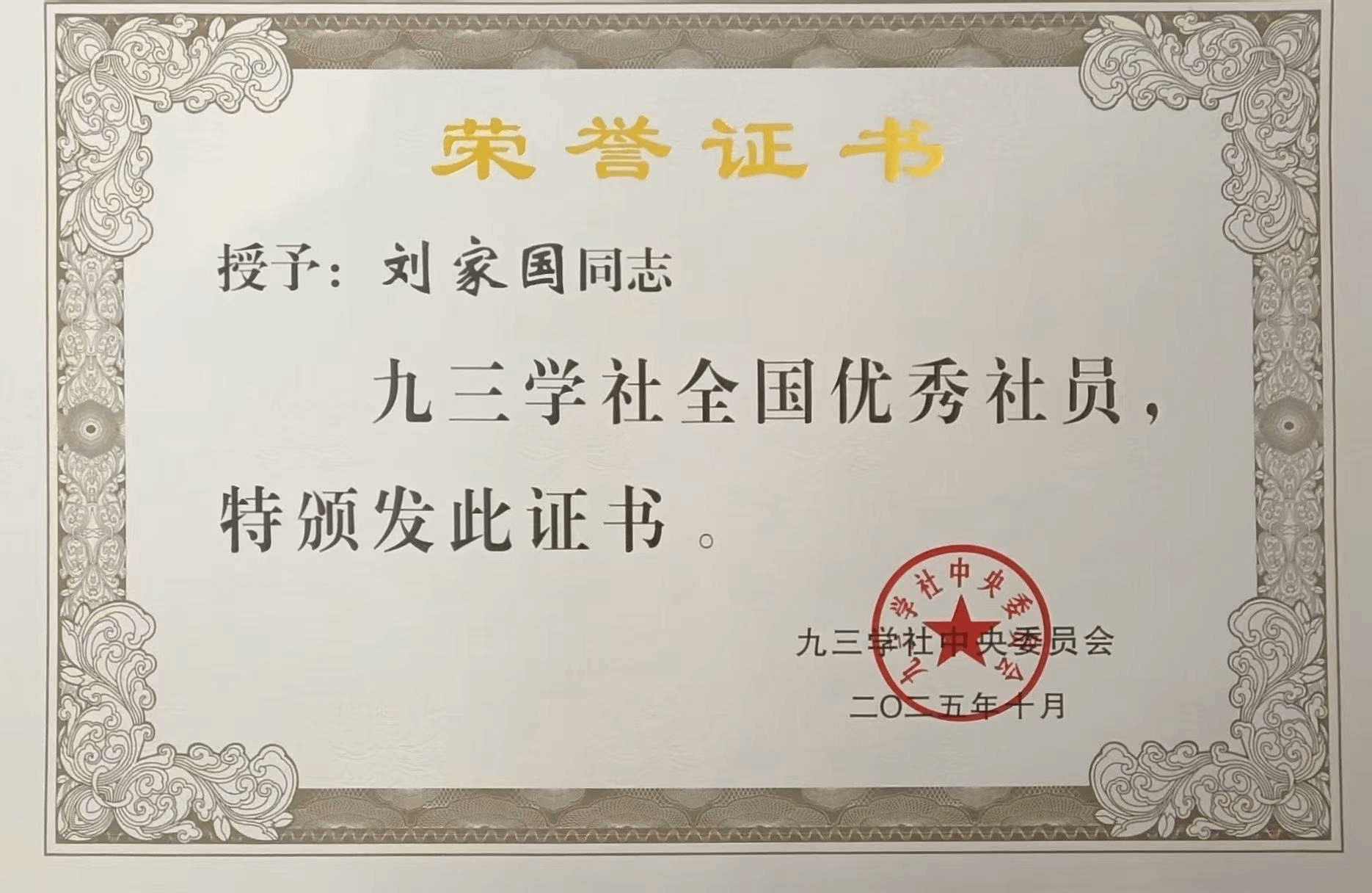 在九三学社创建80周年之际,九三学社中央印发《九三学社中央关于表彰全国优秀社员、全国优秀社务工作者、全国优秀省级组织和全国优秀基层组织决定》,对在工作中作出突出成绩的省级组织、基层组织、社员和社务工作者予以表彰。我校九三学社基层委员会主委刘家国教授获“九三学社全国优秀社员”称号。