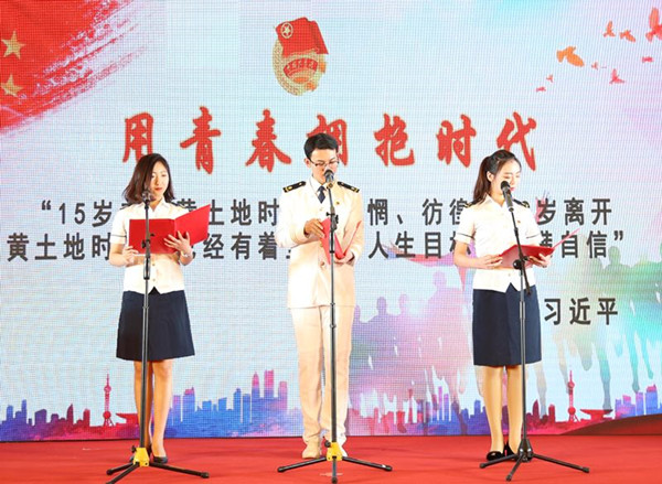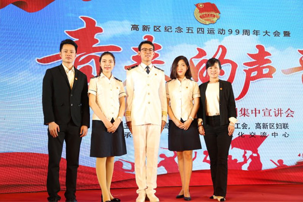 高新区党工委委员、区总工会主席刘源波、团市委副书记林木出席会议并对高新区广大团员青年及共青团工作提出了希望和要求。本次大会共分为“青春的使命”、“青春的声音”和“青春的力量”三个章节。活动伊始,“四进四信”理论宣讲团成员与即将入团的新团员们一起庄严宣誓,重温入团誓词,弘扬“五四”爱国精神,牢记青春的使命,增强共青团员的荣誉感和使命感;然后,“四进四信”理论宣讲团成员于活动现场中亮相、接受聘书,并进行首次集中宣讲,航运经济与管理学院“四进四信”理论宣讲团成员陶晨阳、杨思懿、孙小凯以“用青春拥抱时代,用生命点燃未来”为主题进行了宣讲,宣讲团三名成员现场配合默契,宣讲效果很好;最后,活动在全场近200名团员青年的团歌合唱中圆满落下帷幕,广大团员青年收获激情,凝聚力量。