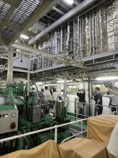 参观完驾驶室,同学们来到了“育鲲轮”的机舱,如果把驾驶室比作船舶的大脑,那机舱就好比船舶的心脏,这里船舶动力系统的核心区域。在机舱内,同学们感受到了机械设备的轰鸣声和扑面而来的热浪。整个机舱内布满了各种管道和机械设备,老师详细介绍了这些设备在运行中的重要性和日常维护的流程,让同学们了解了船舶内部系统复杂而精密的技术构造。
