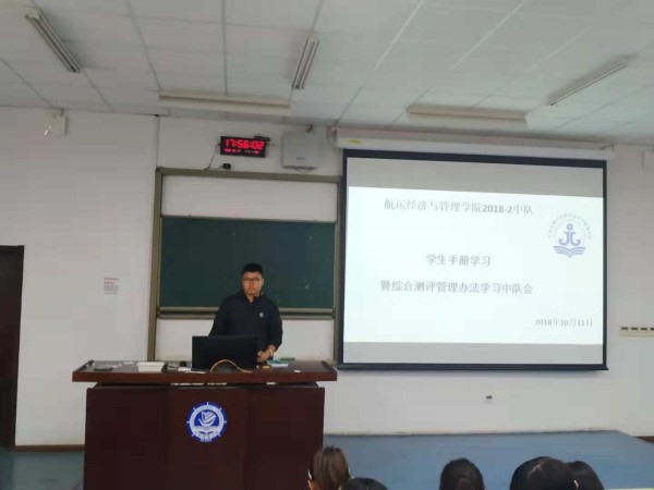 为了全面贯彻党的教育方针,更好地完成学校立德树人的任务,培养高素质创新型人才大学生,帮助中队学生更好地投身大学生活,航运经济与管理学院2018-2中队于10月17日召开学生手册学习中队会议。会议由中队指导员崔安迪主持召开,中队全体学生参加。