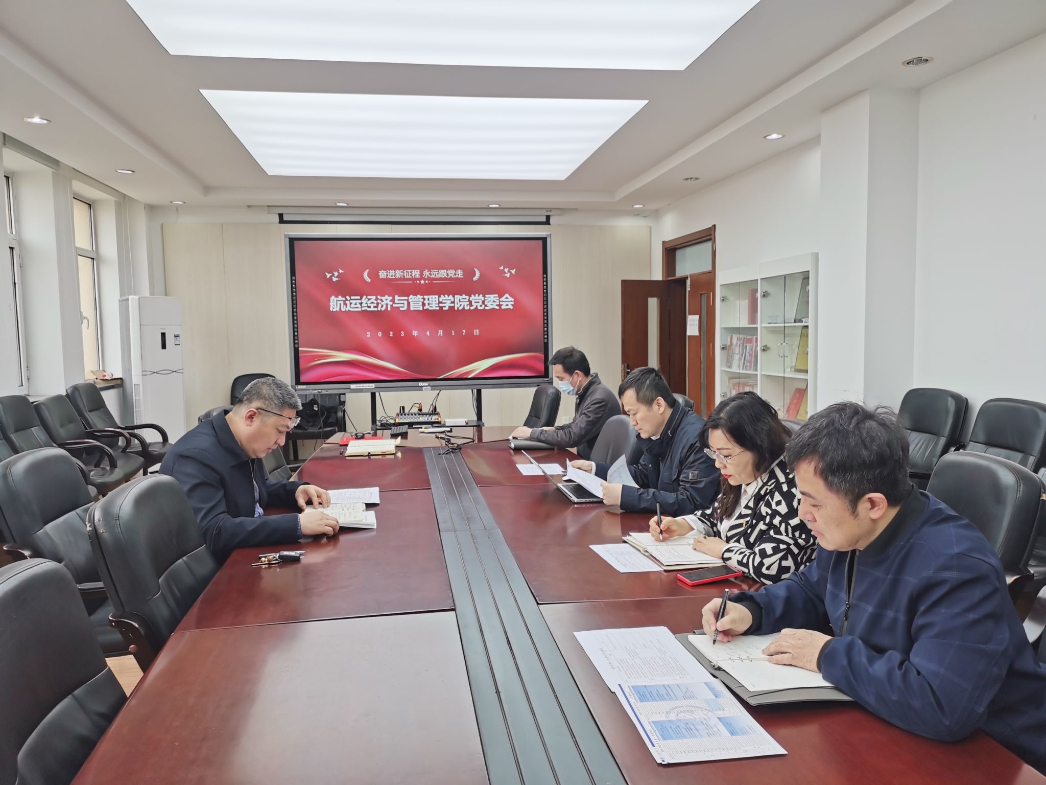 4月17日上午,航运经济与管理学院党委在管理楼B座413B会议室召开2023年第四次党委会(扩大)。学院党委书记张罕育主持会议,学院党委委员、领导班子成员、“双创”项目负责人参会。