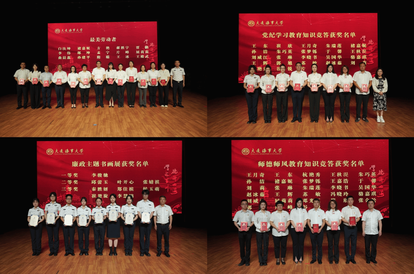 学院党委副书记王振兴宣读学院“最美劳动者”表彰决定并颁奖。学院副院长沈立新公布党纪学习教育知识竞答获奖情况并颁奖。学院副院长于少强宣布廉政主题书画展获奖情况并颁奖。学院副院长黄庆波公布师德师风教育知识竞答获奖情况并颁奖。