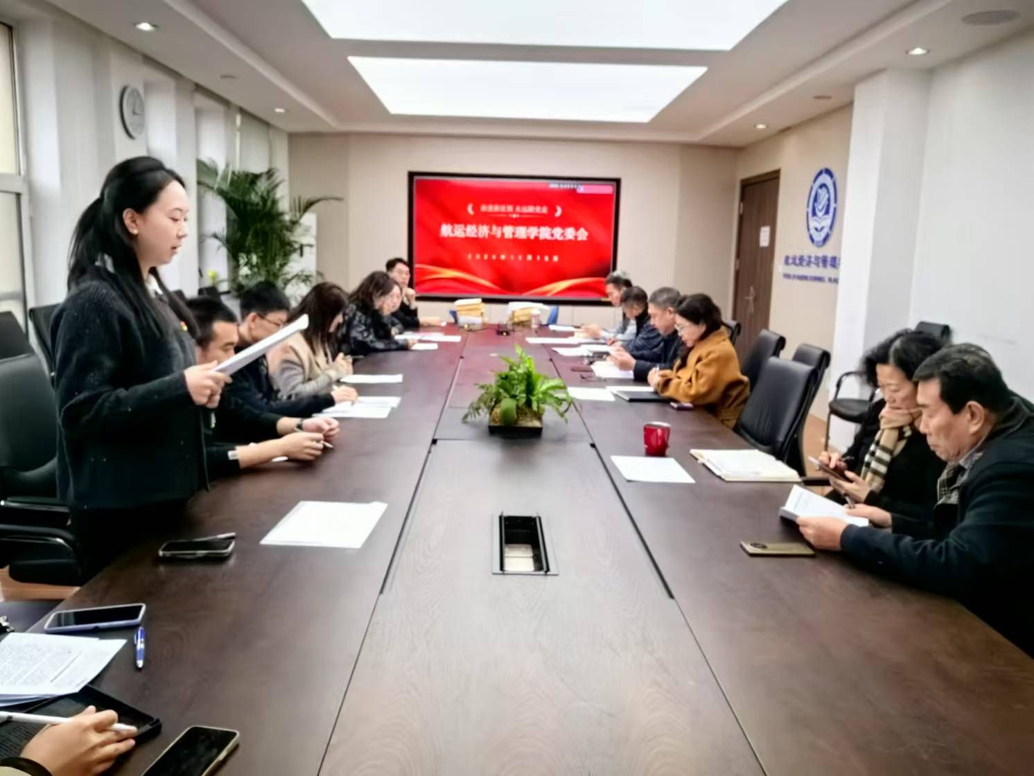 2024年12月19日下午,航运经济与管理学院在管理楼B座413B会议室召开党委会,讨论党员发展转正、第三批三星级党建“双创”培育创建样板支部半年汇报等事宜。学院党委委员,党支部书记,部分教师代表参加会议,会议由学院党委书记张罕育主持。
